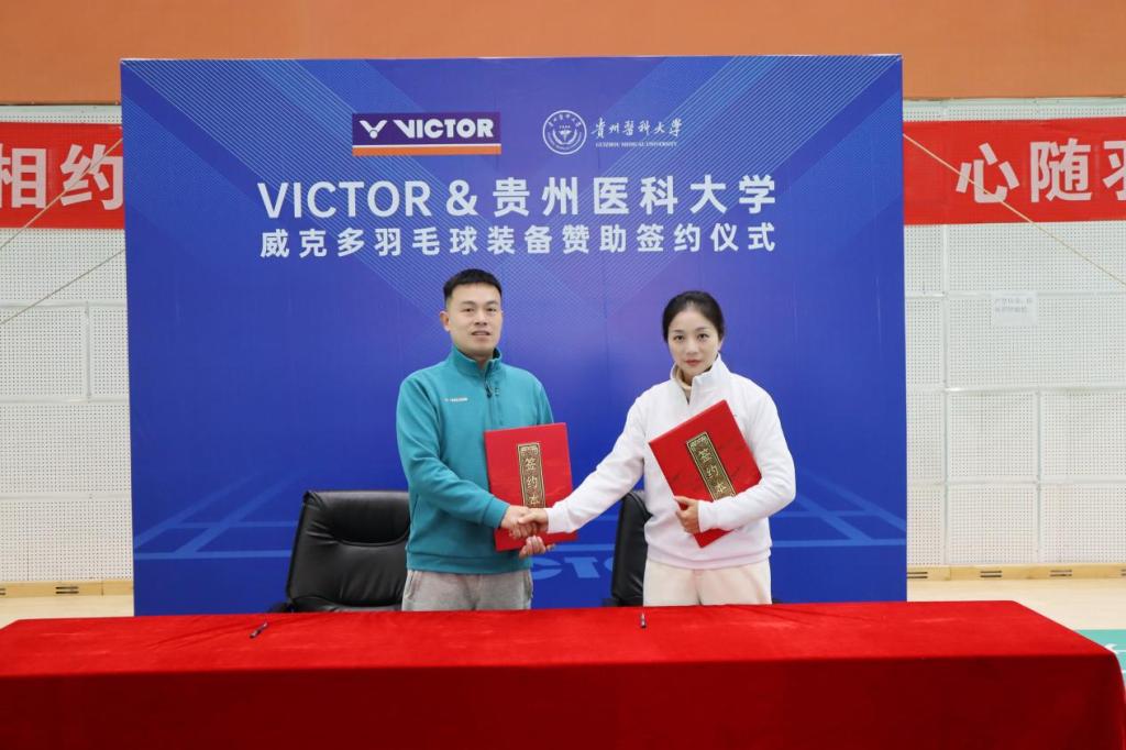 周利、邰飞波分别代表双方签署了赞助协议,标志着校企合作关系的正式建立。威克多体育用品有限公司与贵州医科大学的深度携手,旨在以体教融合为核心,构建“专业培养+产业赋能”的双向共赢生态。双方将以此为契机,加强合作交流,深化体教融合,树立校企合作标杆,为贵医乃至全省羽毛球运动的发展,为体育强国建设贡献力量。